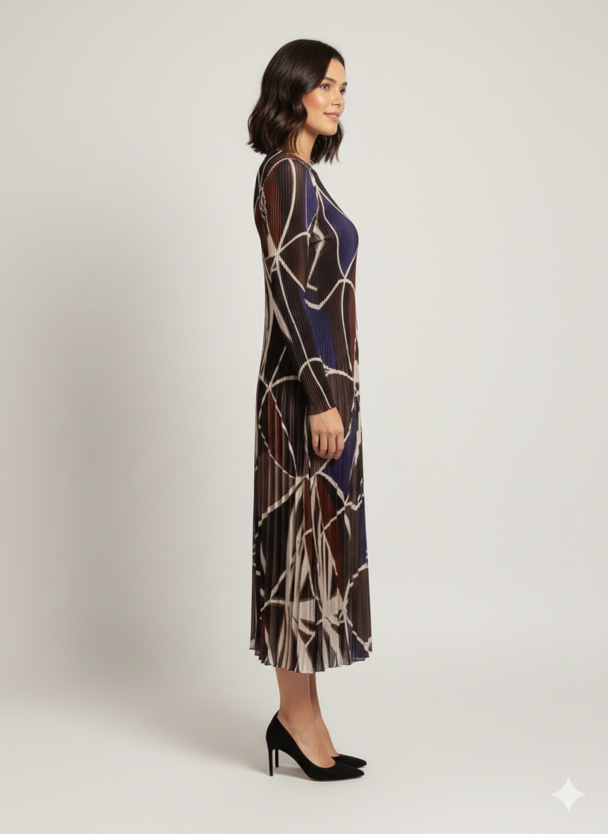 Abito Maxi Plissé a Motivo Geometrico Astra Eleganza dinamica e stile contemporaneo. Esalta la tua silhouette con questo abito midi dal design sofisticato, perfetto per chi cerca un look distintivo che non passa inosservato. Caratterizzato da una raffinata lavorazione plissé all-over, l'abito of...