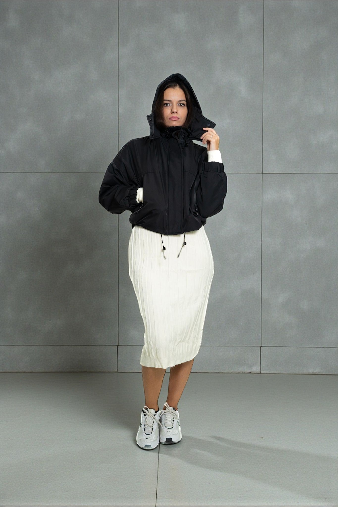 Il punto chiave che definisce questo capo è l'eleganza funzionale: un giubbino corto color sabbia che fonde il dinamismo della trapuntatura a onde con il lusso del maxi cappuccio in pelliccia, completato da polsini in maglia tecnica per un look sofisticato ma pronto alla vita urbana.